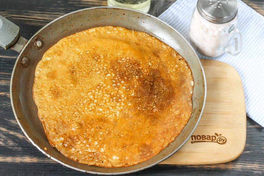 Прогрейте сковороду и смажьте в первый раз ее дно растительным маслом. Влейте порцию блинного теста и выпекайте блин в течение 1 минуты, затем аккуратно переверните на другую сторону и выпекайте такое же количество времени. Будьте аккуратны — такие блины очень нежные и могут порваться.