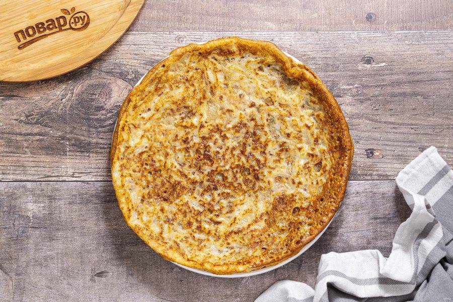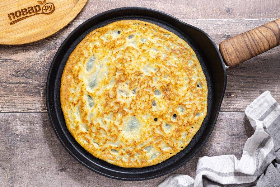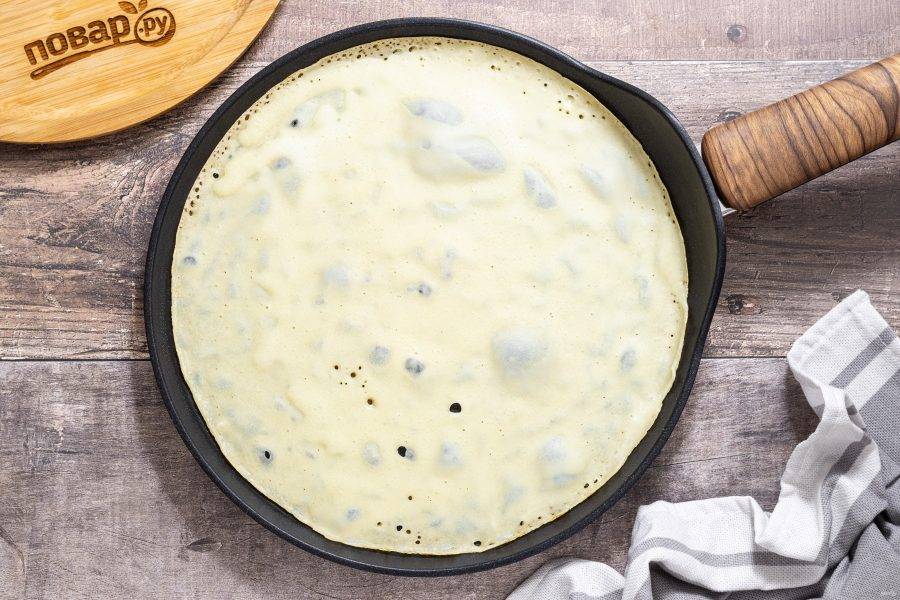 Хорошо разогрейте сковороду на среднем огне. Первый раз немного смажьте растительным маслом. Влейте столько теста, чтобы оно равномерно распределилось тонким слоем по диаметру сковороду. Выпекайте до золотистого цвета.