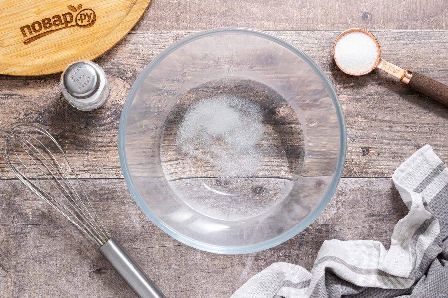 Влейте в глубокую миску теплую воду. Затем добавьте сахар и соль. Размешайте венчиком, чтобы сахар и соль растворились.