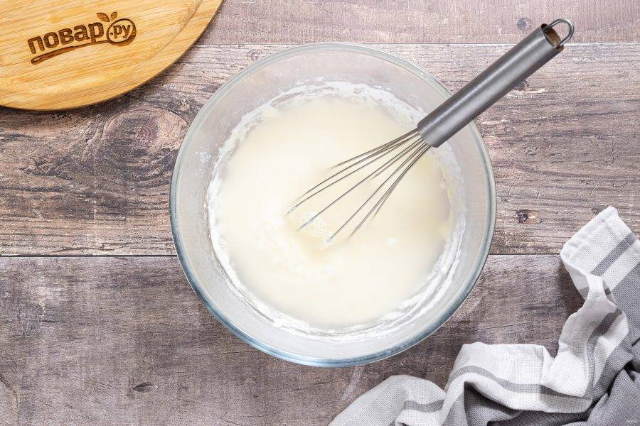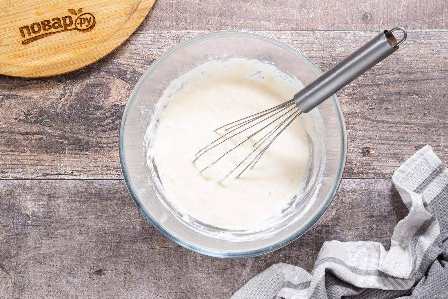 Венчиком сразу перемешивайте, чтобы не оставалось комочков. На этом этапе по консистенции тесто должно получиться, как на оладьи.
