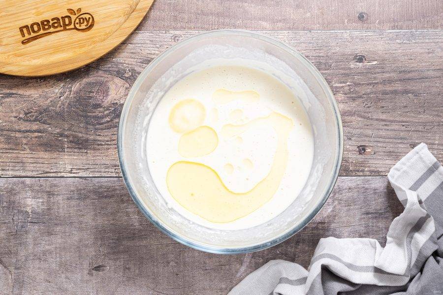 В конце влейте растительное масло, еще раз перемешайте. Накройте тесто крышкой или пленкой, оставьте на 8-10 минут.