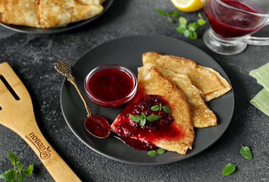 Блинчики разложите по тарелочкам и полейте брусничным соусом. Приятного аппетита!