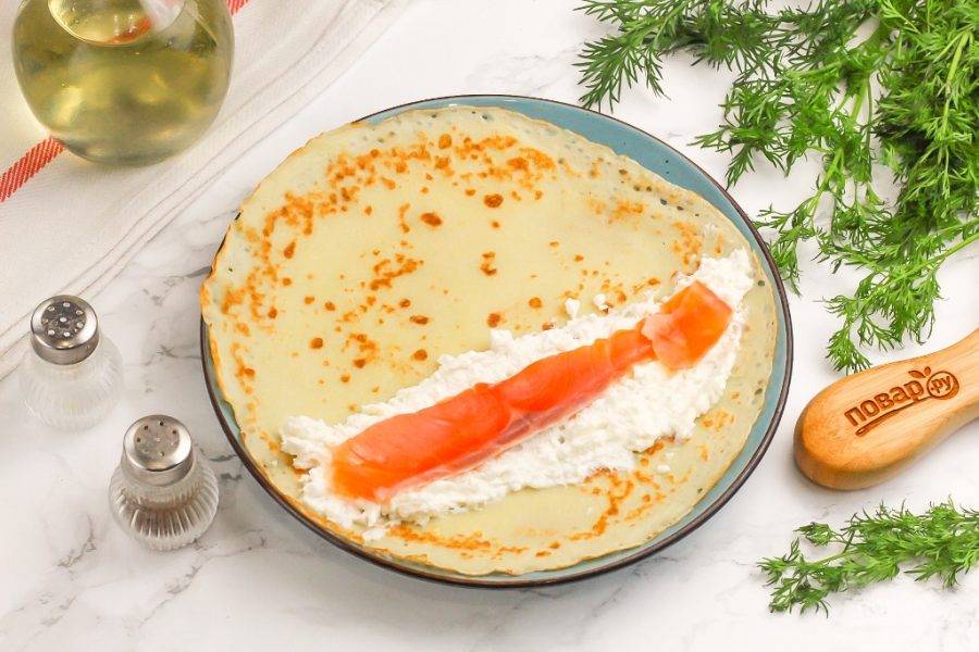 Затем смажьте творожным сыром часть блина и выложите на него нарезку форели. Сверните трубочкой.