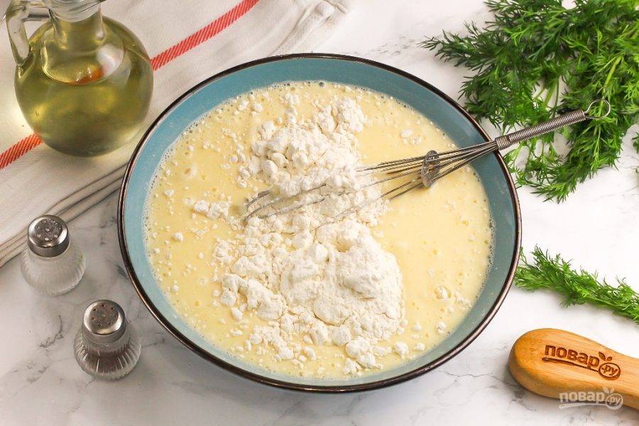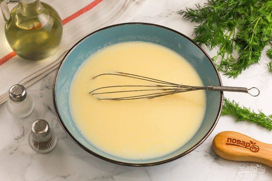 Взбейте венчиком все содержимое емкости примерно 2-3 минуты. По желанию можно всыпать в емкость измельченную зелень укропа или какую-нибудь приправу, специю.