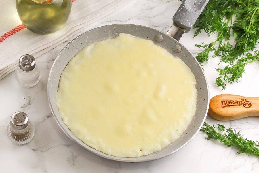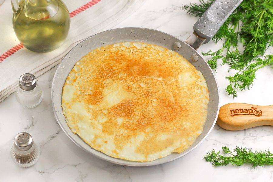 Прогрейте сковороду на плите и смажьте растительным маслом. С помощью половника влейте на сковороду немного теста и испеките румяный блин 1 минуту. Обязательно нагрев убавьте до среднего, иначе блины будут подгорать.