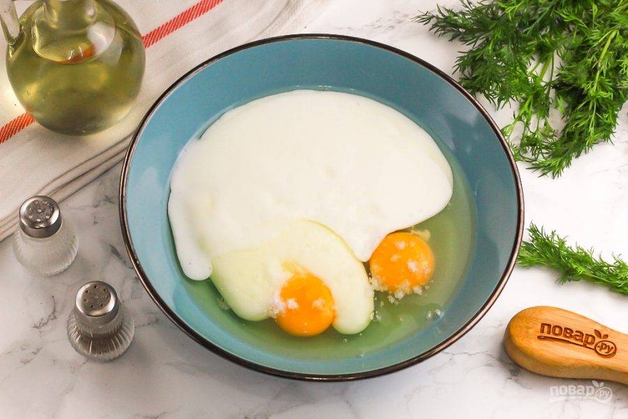 Вбейте в глубокую емкость куриные яйца, добавьте соль и кефир любой жирности. Лучше всего использовать продукты комнатной температуры.
