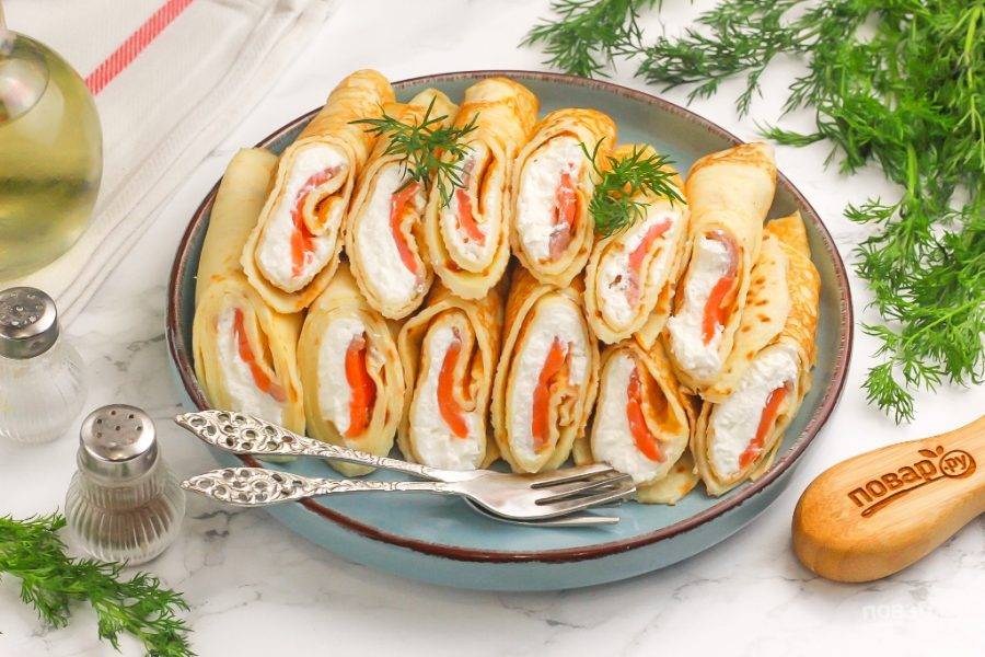 Никто не сможет отказаться от блинов с форелью! Чтобы закуска приобрела сливочный вкус, добавляйте в качестве начинки влажный творожный сыр или плавленый. По желанию можно и свежую зелень!