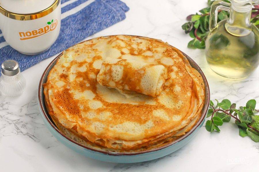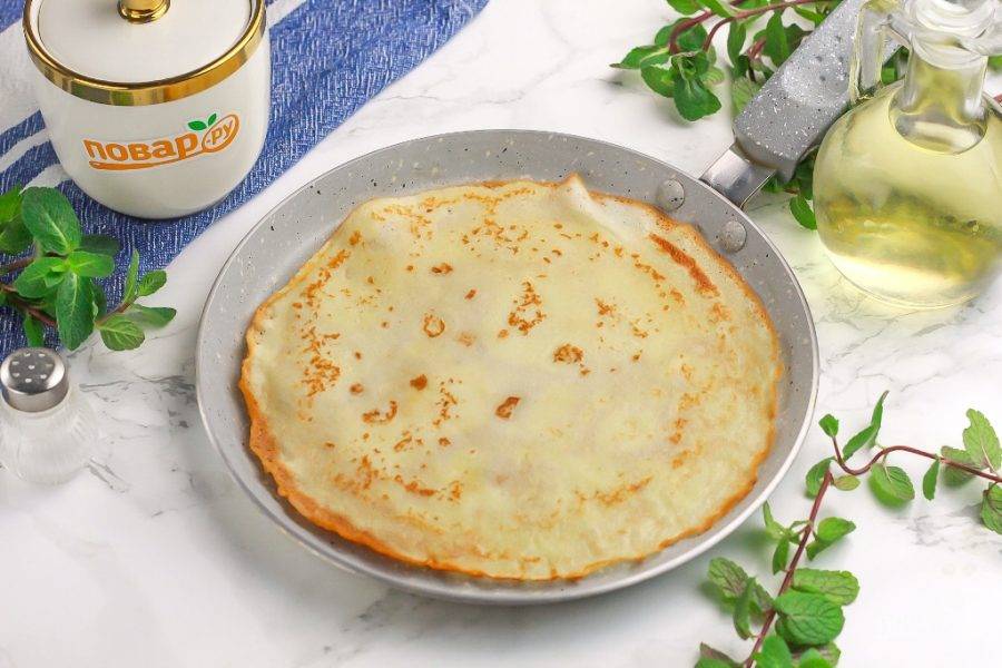 Затем влейте растительное масло и перемешайте. Прогрейте сковороду на плите и смажьте ее маслом. Влейте немного блинного теста и округлите его. Обжарьте блин по 1-2 минуте с каждой стороны до золотистой корочки.