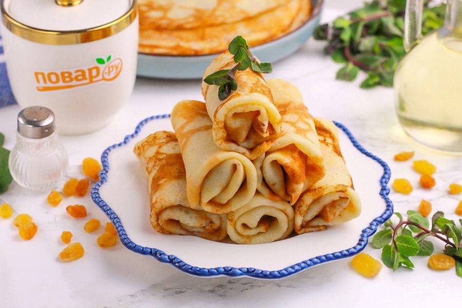Подайте блины с изюмом к столу. Они вкусны как в теплом, так и в холодном виде. Приятного вам аппетита!