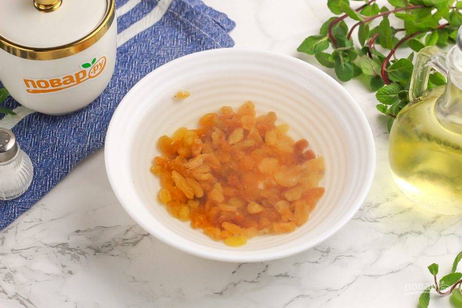 Изюм всыпьте в пиалу или креманку и залейте кипятком. Оставьте его в жидкости, пока не обжарите все блины. После чего жидкость слейте.