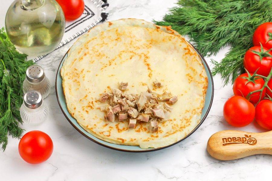 Нарежьте отварную курицу мелкими кубиками или нарвите руками на волокна. Выложите 1 ст.л. куриного мяса на край блина.