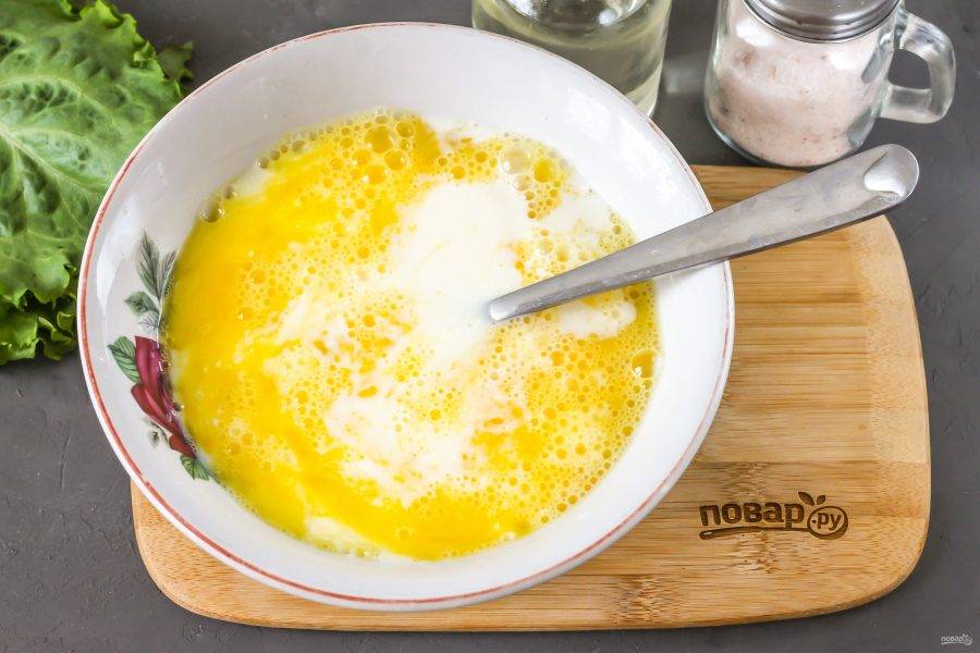 Куриные яйца вбейте в глубокую емкость, всыпьте две щепотки соли и взбейте. Влейте молоко любой жирности и еще раз взбейте.