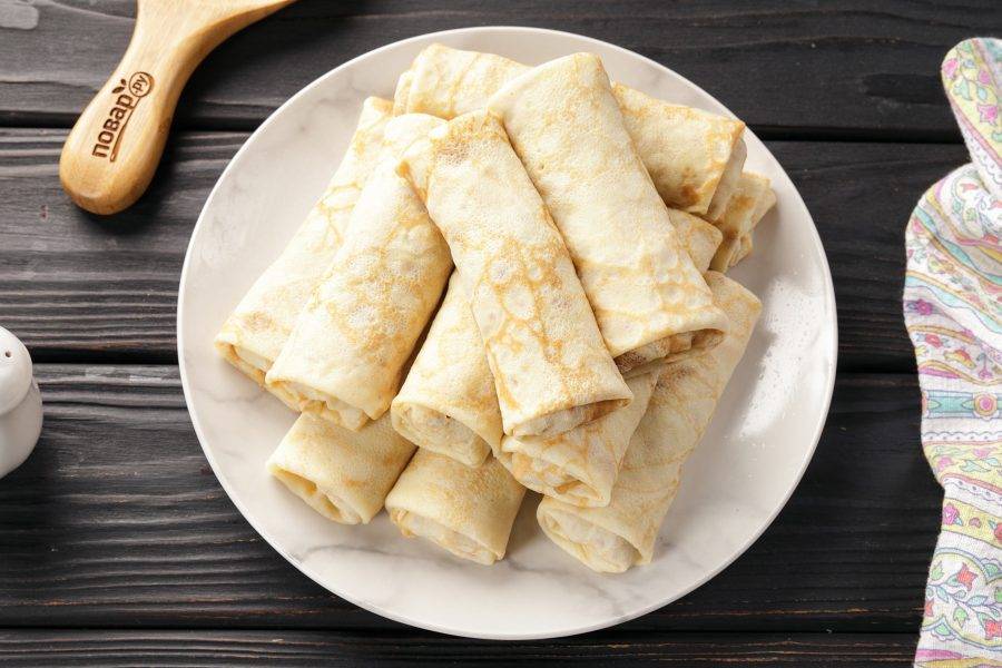 Готовые блинчики складывайте друг на друга и накрывайте крышкой, чтобы они не высыхали.