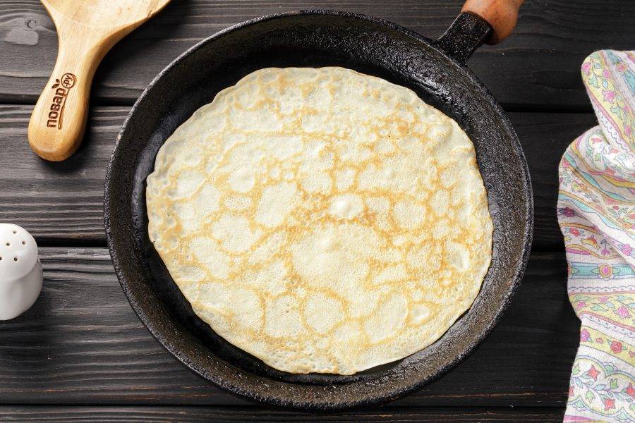 Блинную сковороду перед первым блином немного смажьте растительным маслом. Тесто наливайте тонким слоем.