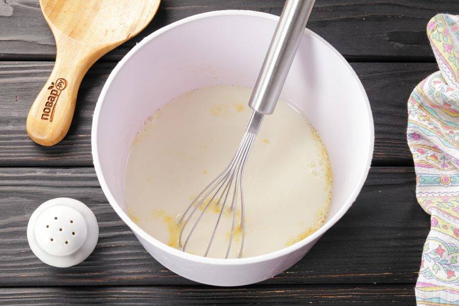 В глубокой миске соедините яйца, соль и сахар. Взбейте.
