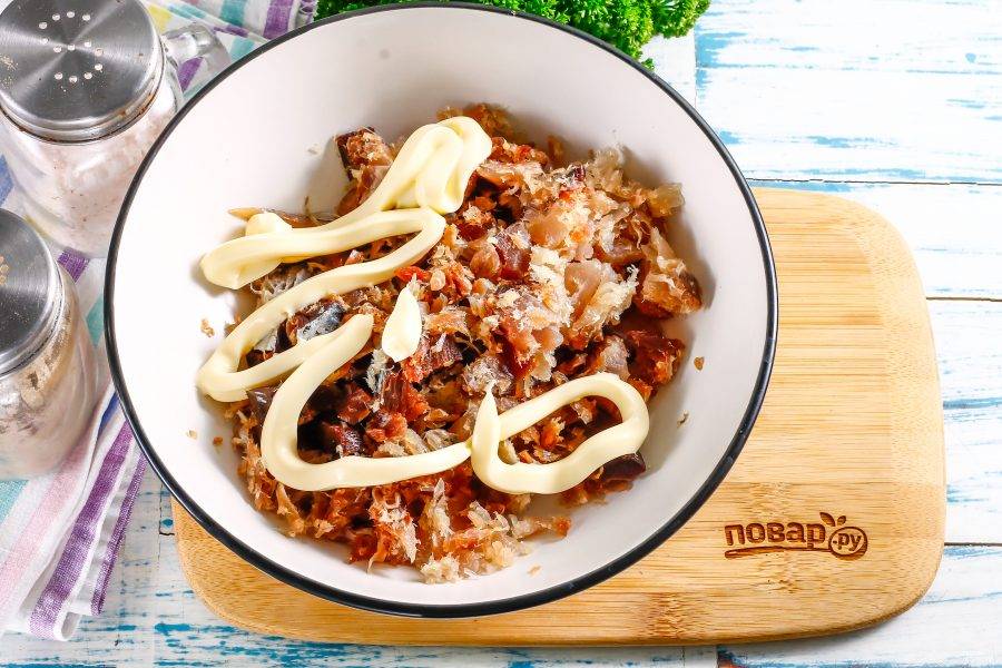В это время разрежьте копченую рыбу пополам, удалите кости, а мякоть нарвите руками на небольшие части и выложите в тарелку. Добавьте майонез и перемешайте.