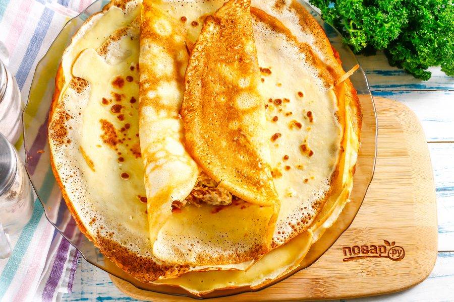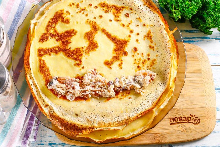 Вкусные блины можно приготовить и с рыбной начинкой, подавая их даже на праздничный стол. Для этого можно использовать как обычную отварную рыбу, удалив кости, так и засоленную красную или копченую.
