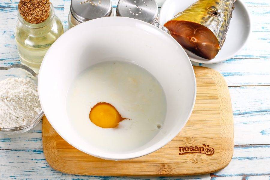 Молоко влейте в глубокую емкость, всыпьте соль и вбейте туда же куриное яйцо. Взбейте все венчиком или вилкой.