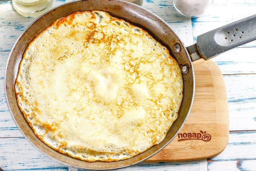 Прогрейте сковороду на плите, смажьте ее в первый раз растительным маслом и влейте на нее порцию теста. Обжарьте блин до румяности по минуте с каждой стороны.