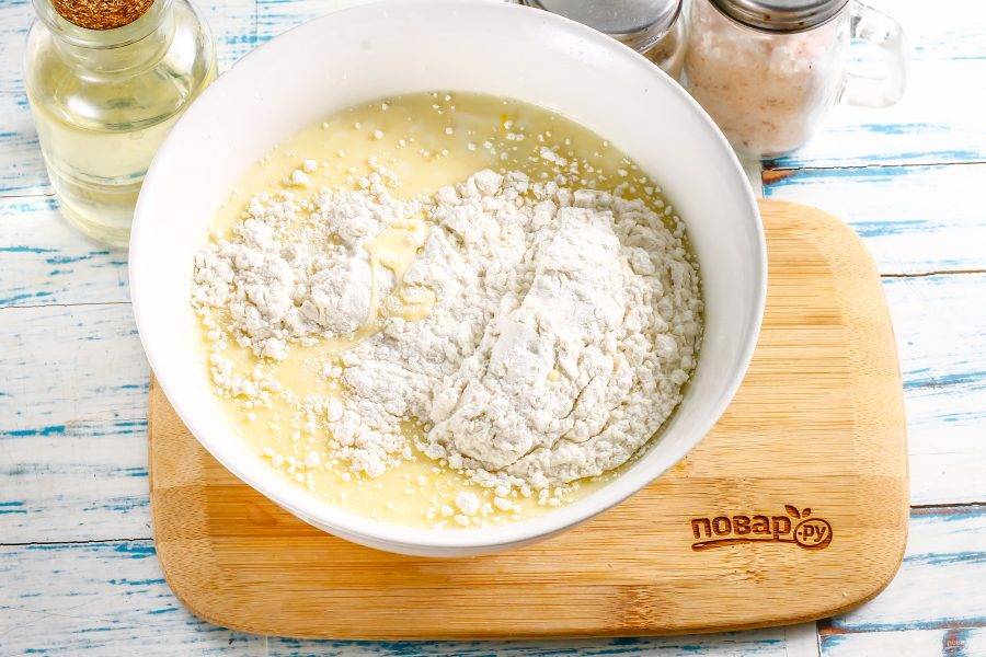 Всыпьте пшеничную муку высшего сорта, еще раз все взбейте, стараясь не допустить образования комочков. Влейте растительное масло и оставьте тесто на 15 минут в покое.