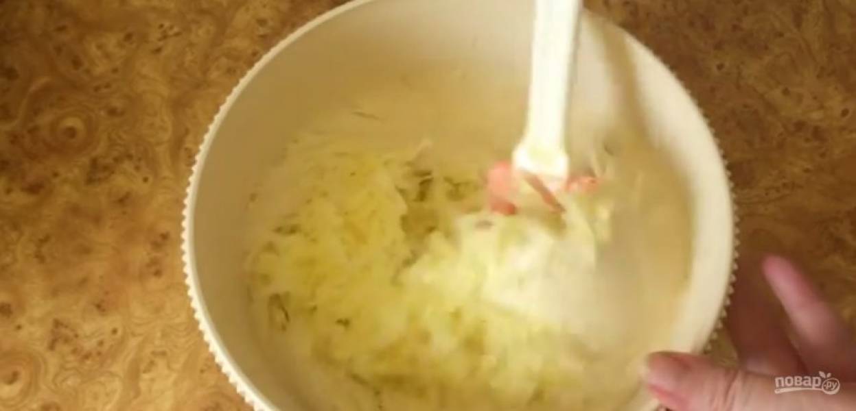 3. Хорошо перемешайте, накройте крышкой и оставьте в теплом месте на 1 час. Добавьте очищенный и натертый на терке картофель. Хорошо перемешайте и оставьте на несколько минут.