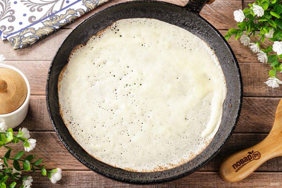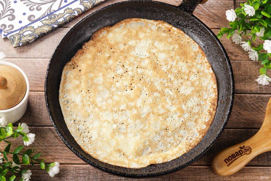 Обжарьте блинчик с одной стороны до золотистого цвета, затем переверните и обжарьте с другой.