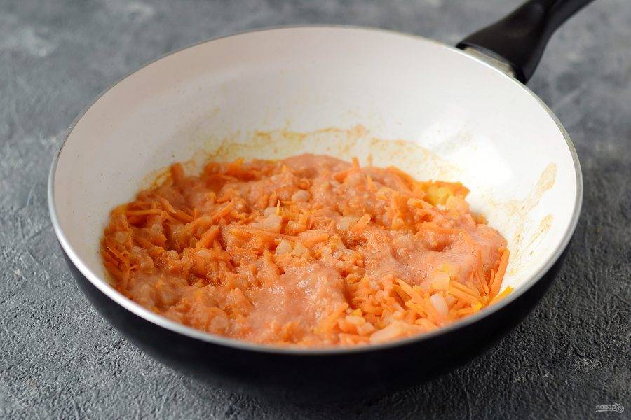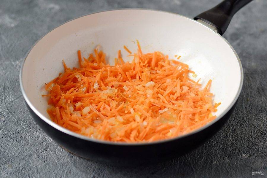 Разогрейте сковороду на среднем огне, обжарьте лук до прозрачности. Добавьте морковь, жарьте овощи до мягкости.