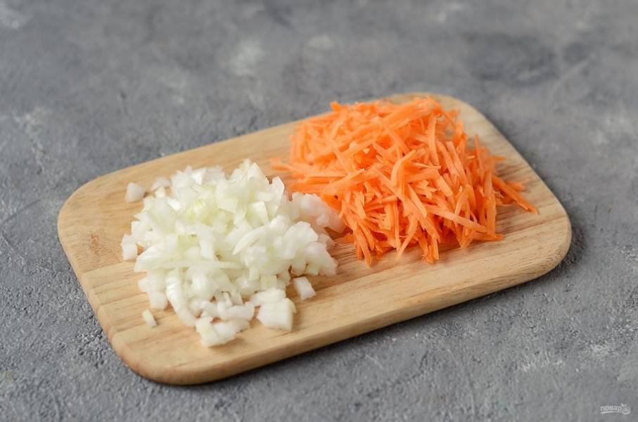 Морковь натрите на терке, репчатый лук нарежьте на мелкие кубики.