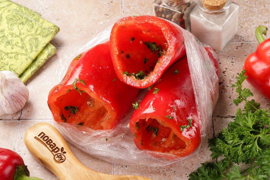 Натрите перцы маринадом со всех сторон. Переложите в пакет, полейте остатками и потрясите. Оставьте на 20-30 минут.