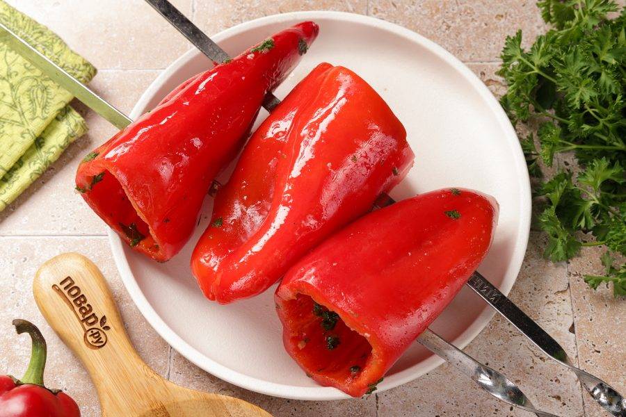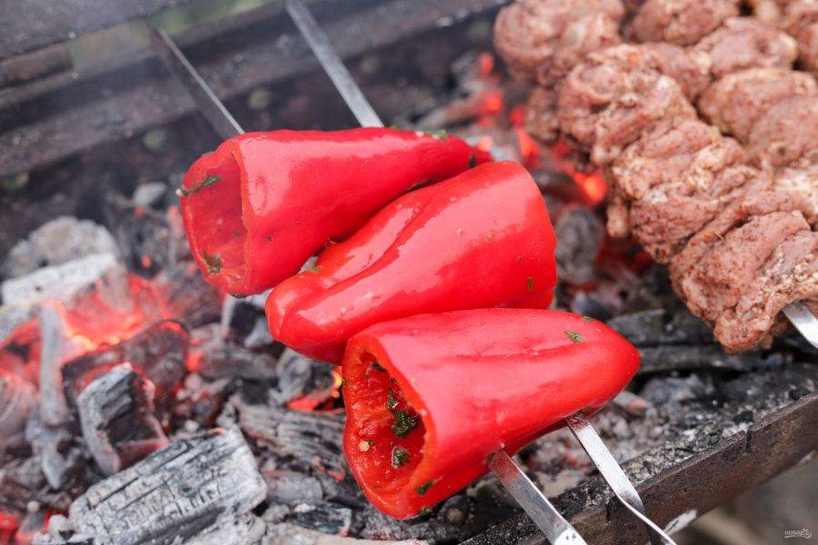 Нанизайте перцы поперёк на два шампура. Если будете использовать один шампур, то перцы в процессе будут прокручиваться. Готовя перцы целиком, вы сохраните под кожицей всю сочность и аромат.