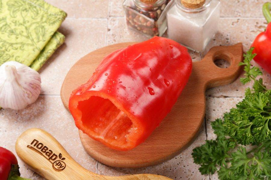 Перцы промойте и удалите плодоножку, вырежьте семенную коробку. Делайте аккуратно, чтобы перец остался целый.