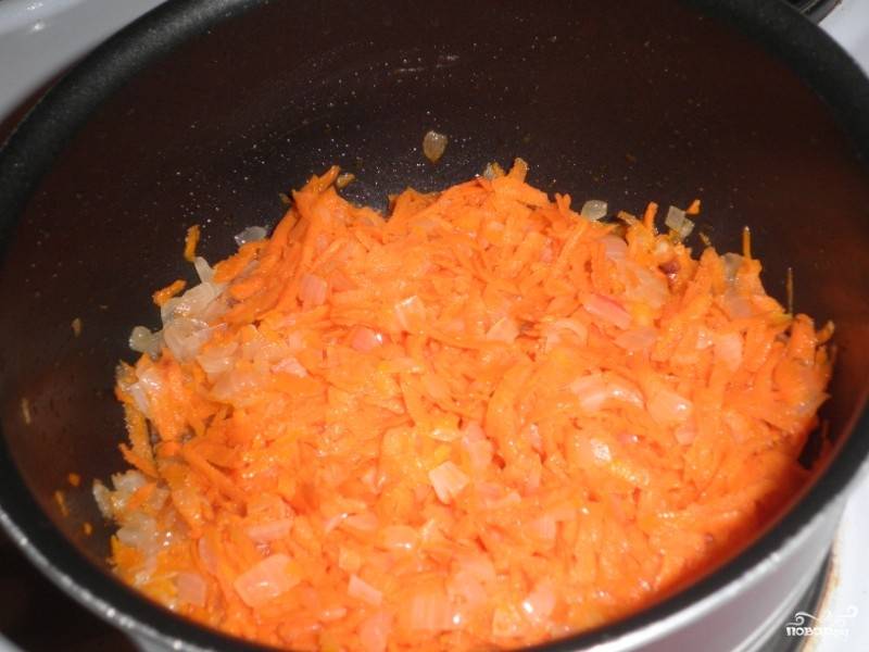 Спассеровать лук и морковь в небольшом количестве масла до золотистого цвета.