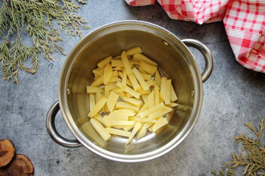 Картофель почистите, сполосните, нарежьте средней соломкой и выложите в кастрюлю, где будете варить борщ.