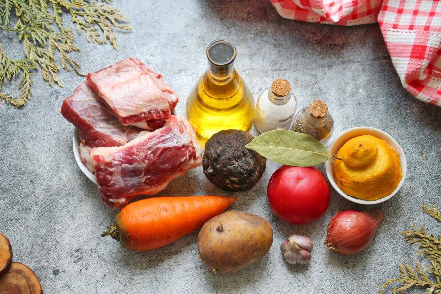 Подготовьте все необходимые ингредиенты для приготовления борща без капусты. Овощи почистите и сполосните. Говядину промойте, выложите в кастрюлю и залейте холодной водой. Все немного посолите, доведите до кипения и варите без крышки в течение 50-60 минут, снимая пену. Говядина должна стать мягкой.