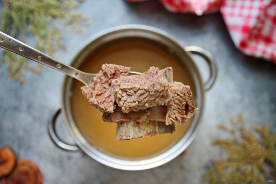В кастрюлю с картофелем процедите бульон. Отварную говядину порежьте на кусочки, удаляя кости, и выложите в кастрюлю. Варите все в течение 10-15 минут, пока не приготовится картофель.