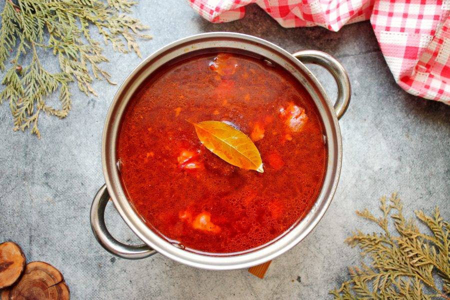 Борщ доведите по вкусу на соль и сахар, добавьте лавровый лист, измельченный чеснок, поперчите. Варите все еще 5 минут, снимите с огня и дайте постоять под крышкой еще 10-15 минут.