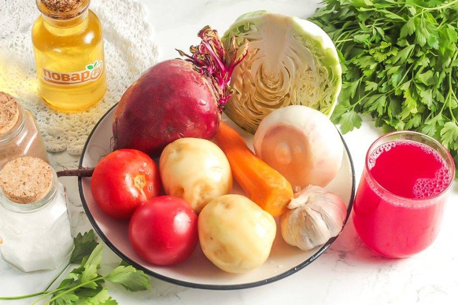 Подготовьте указанные ингредиенты. Свеклу, морковь, лук и картофель очистите от кожуры и промойте в воде.