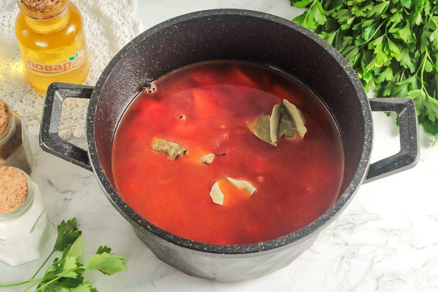 Натрите свеклу на терке и треть ее отложите в сторону, добавите ее практически в конце варки. Остальную нарезку свеклы выложите в емкость и залейте водой. Всыпьте соль, лавровые листья и отварите примерно 15 минут.