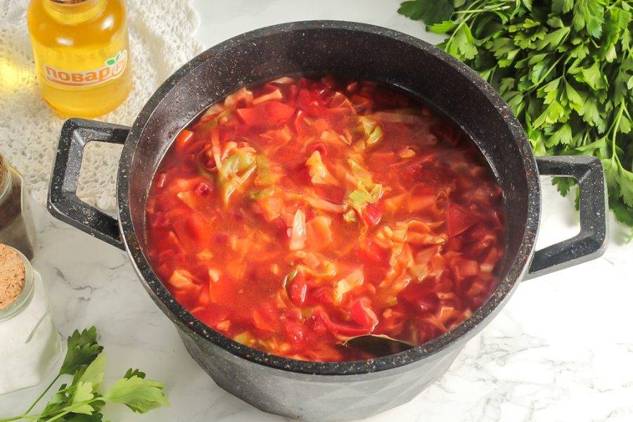 Затем выложите оставшуюся нарезку свеклы, она поможет придать борщу аппетитный бордовый цвет. Спрессуйте очищенные зубчики чеснока и проварите все еще 3-4 минуты. Накройте емкость крышкой и выключите нагрев. Можно всыпать измельченную зелень. Дайте борщу пропариться еще 10 минут.
