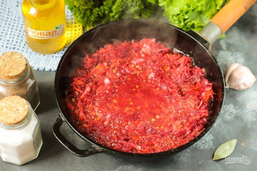 Натрите свеклу и морковь на терке с мелкими ячейками, нарежьте лук мелкими кубиками. Отпассеруйте все вместе на сковороде в растительном масле примерно 5-6 минут.