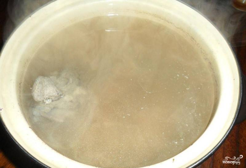 1. Ребра помещаем в воду, ставим на огонь. Как закипит, убавим огонь, добавим картошку. Ждем, пока появится пена, и снимаем ее. Варим дальше до готовности картошки на среднем огне.