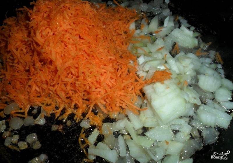 2. Пока готовится бульон, измельчим сало, морковь и лук и бросаем на сковородку. Из сала вытопится жир, и овощи будут жариться на нем.