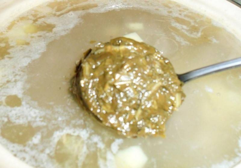 3. Когда лук станет прозрачным, морковь - румяной, а сало превратится в шкварки, добавим зажарку в бульон, также сюда отправим щавель, капусту и соль. На небольшом огне варим еще примерно 15 минут.