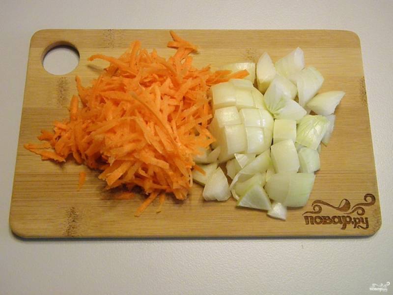 Порежьте не слишком крупно лук и морковь. При таком способе нарезки моркови она меньше вбирает жира в время жарки.