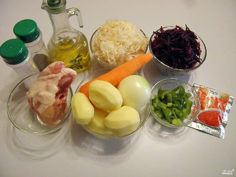 Приготовьте продукты для борща. Я заранее нарезала соломкой свеклу, все очистила. Если хотите сварить борщ на говядине или свинине, то заранее приготовьте бульон. Я варю на курице.