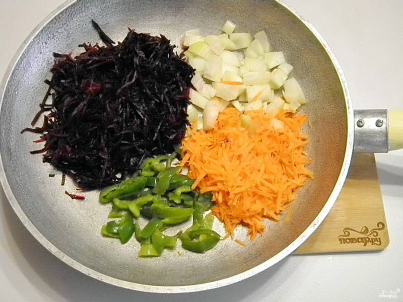 На сковороде с растительным маслом или жиром обжарьте до полуготовности порезанную соломкой свеклу, болгарский перец, морковь и лук.