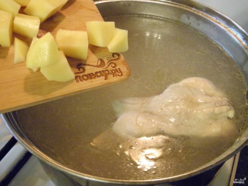 В куриный бульон добавьте порезанный картофель. Проварите 10 минут.