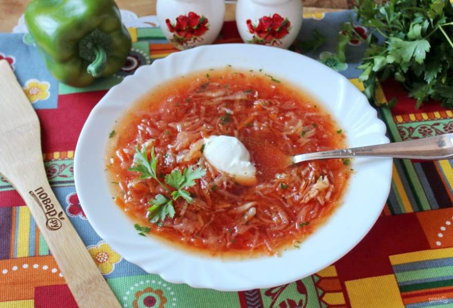 Ароматный, вкусный и полезный борщ с редькой готов. Подавайте со сметаной. Приятного аппетита!