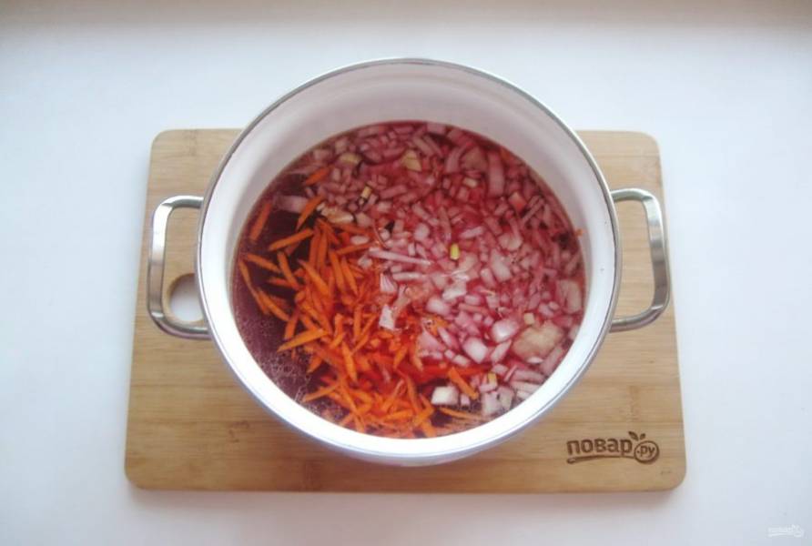 Репчатый лук мелко нарежьте, а морковь натрите на терке. Добавьте в кастрюлю.