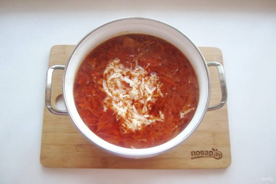 В кастрюлю налейте бульон. Свеклу натрите на терке и выложите в кастрюлю. Начинайте варить борщ.